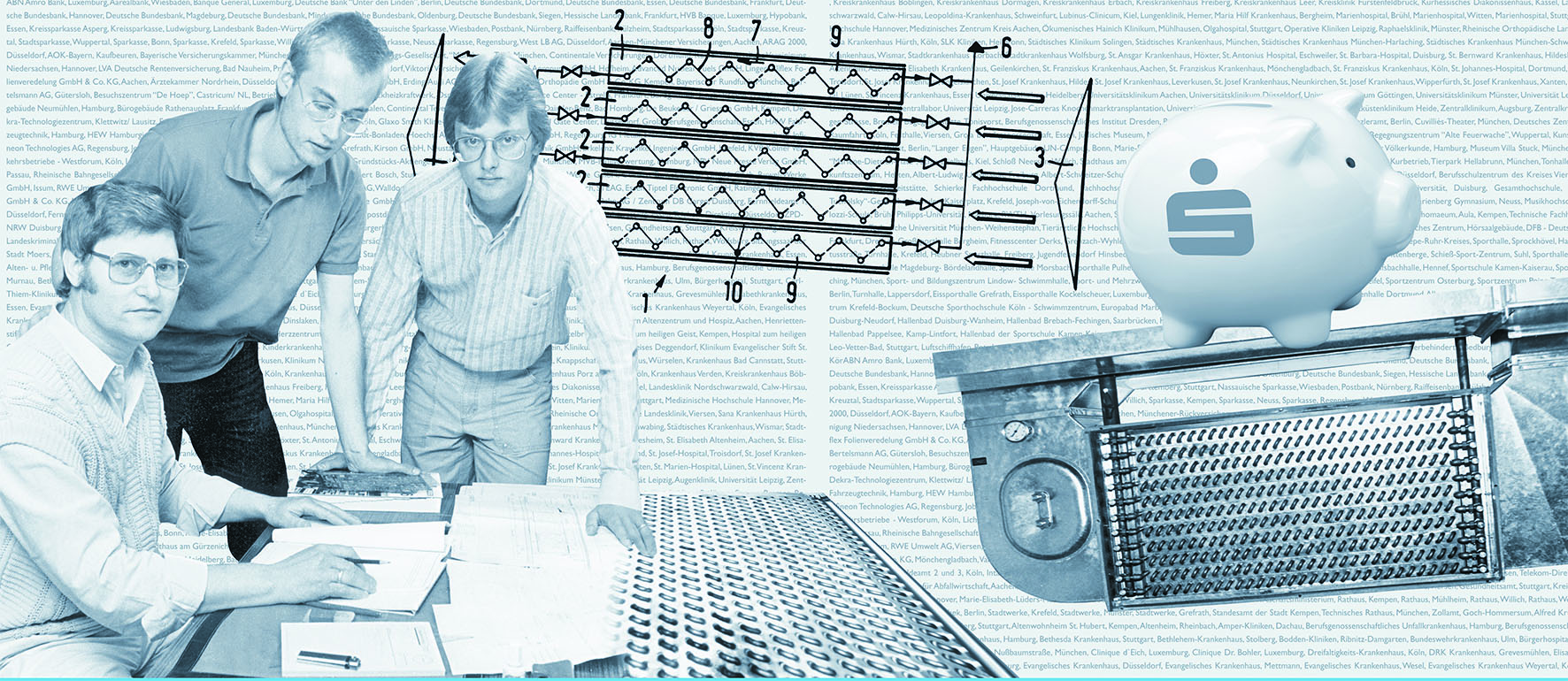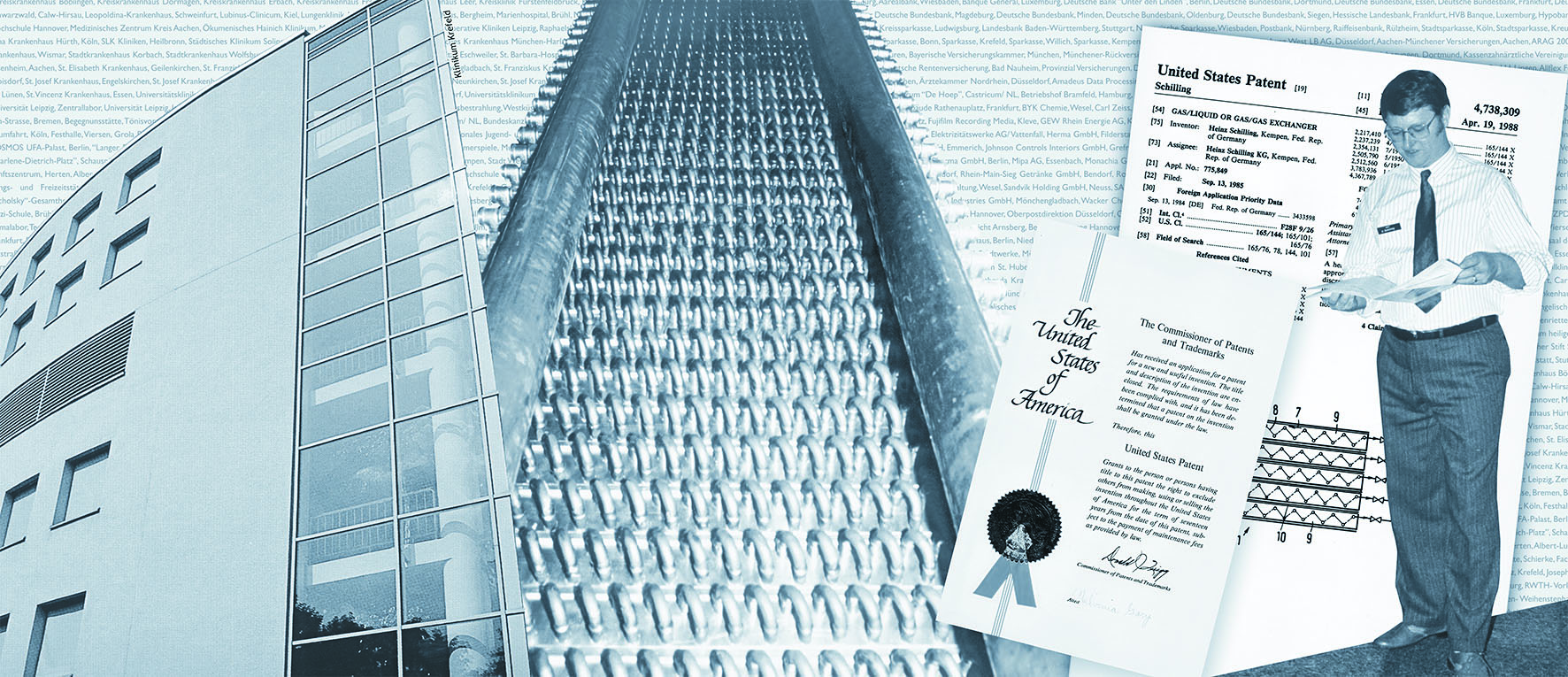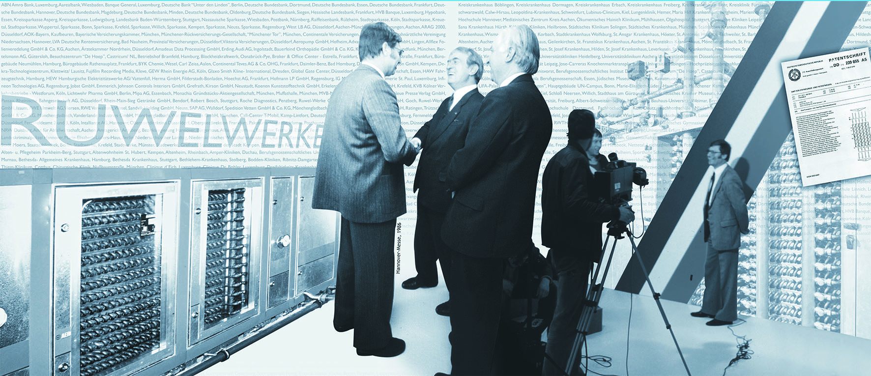 Anfang 1984 kam die Wärmetauscher-Weiterentwicklung, der Gegenstrom-Schicht-Wärmeaustauscher (GSWT®) erstmals in der Sparkasse Krefeld (Vluyner Platz) zum Einsatz.